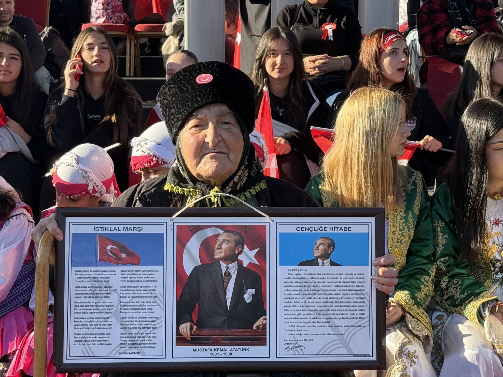 Fatma Rahibe Kanıkuru Loğoğlu namı diğer İstanbullu Kuvvacı Kara Fatma Vatan caddesinde yapılan Cumhuriyetin 102. Kuruluş yıldönümüne elinde istiklal marşı, gençliğe hitabe, Atatürk’ün resminin yer aldığı panoyu tutarak saatlerce bayraktar oturmaz diyerek ayakta töreni İzledi.